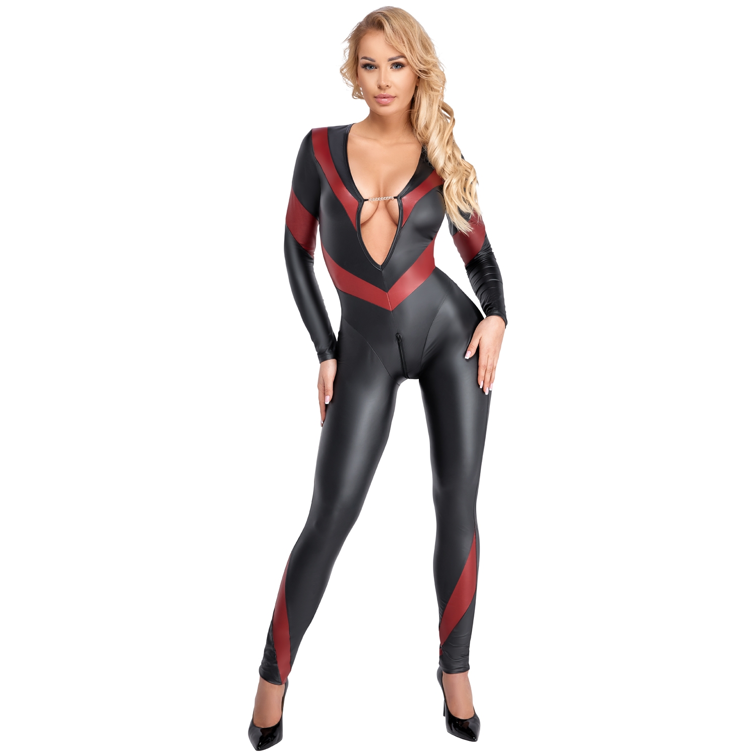Udforsk nattens fulde potentiale med det røde og sorte Cottelli PARTY Catsuit, en fræk blanding af mystik og sexappeal. Det tofarvede mat look fanger din partners blik og hvisker hemmeligheder om ufortalte eventyr. De lange ærmer, buksebenene og de kontrasterende røde striber arbejder sammen om at kæle for dine kurver og fremhæver dinsilhuet. Den dybe udskæring blotter din barm, hvor en sølvfarvet kæde funkler og fanger blikket.Som prikken over i’et er catsuitet udstyret med en dobbelt lynlås, der går fra ryggen gennem skridtet til fronten og giver et hint til de frække muligheder, der ligger forude. Uanset om du er dansegulvets midtpunkt eller planlægger en romantisk aften for to er catsuitet et oplagt valg.